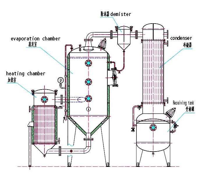 The single-effect external circulation vacuum concentrator consists of a heater, an evaporator, a demister, a condenser, a cooler, and a receiving tank. All components in direct contact with the material are made of high-quality stainless steel. This equipment